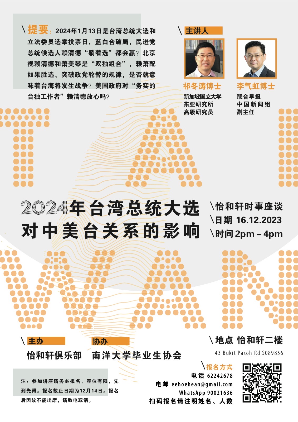16/12/2023 | 台湾总统大选对中美台关系的影响座谈会 怡和轩俱乐部主办, 南洋大学毕业生协会协办 |