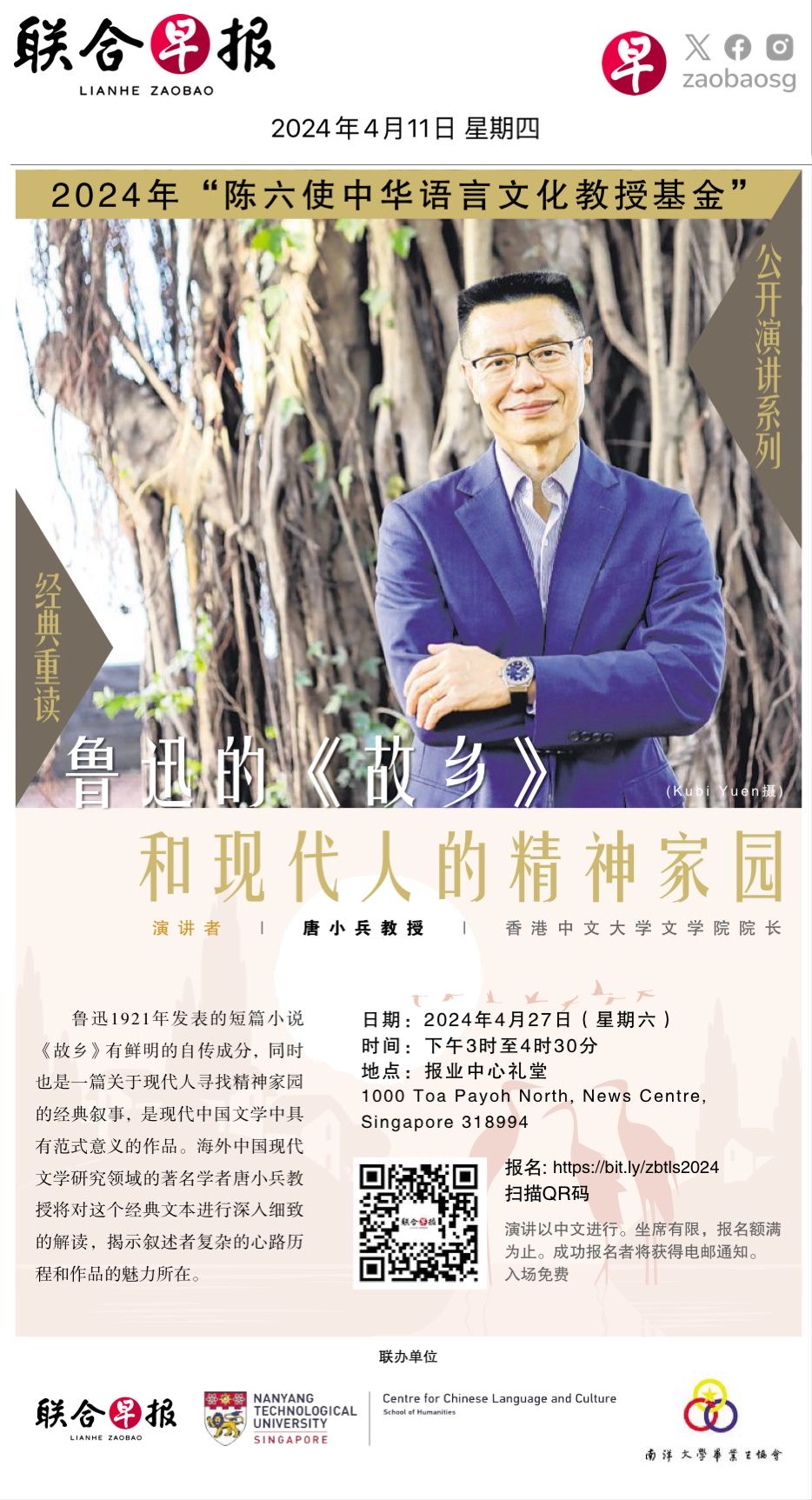 26/04/2024 | 陈六使中华语言文化教授基金访问教授公开演讲系列 唐小兵教授的第一场演讲(以英文进行) |