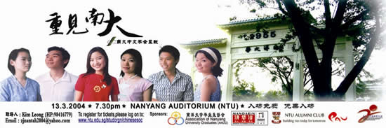为庆祝学会创立20周年纪念,南洋理工大学中文学会将于04年3月13日晚上7时30分假南洋大讲堂(NanyangAuditorium)举行《重见南大》音乐剧演出。